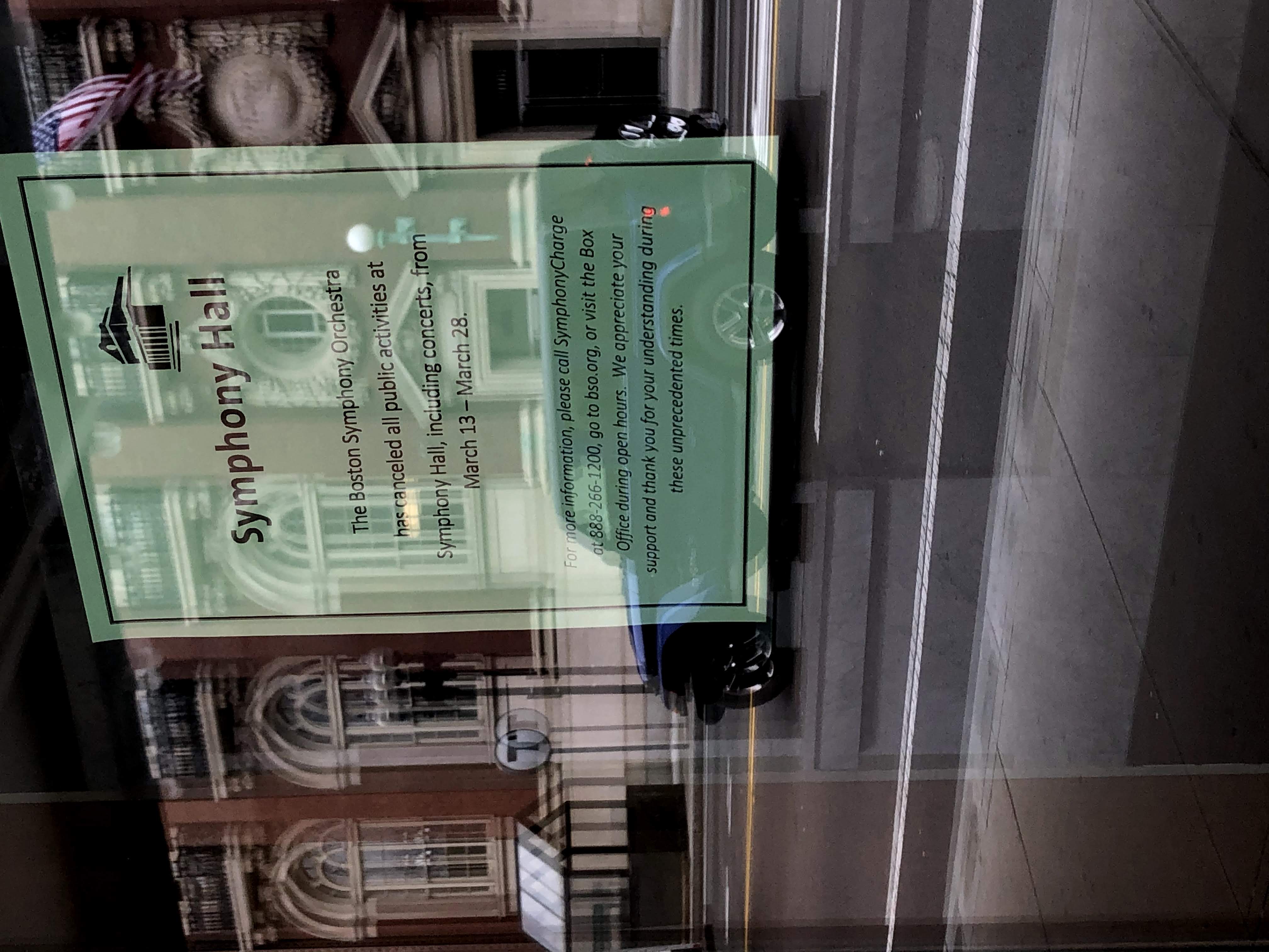 This is a photograph of a sign posted in the window of the Boston Symphony Hall. This sign illustrates how sudden many of the closures were due to Covid-19, leading to suddenly canceled events.