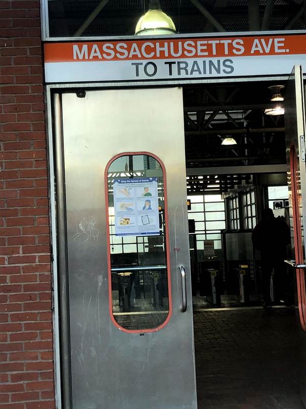 Sign Outside Mass. Ave Stop Explains How to Stop the Spread of Germs
