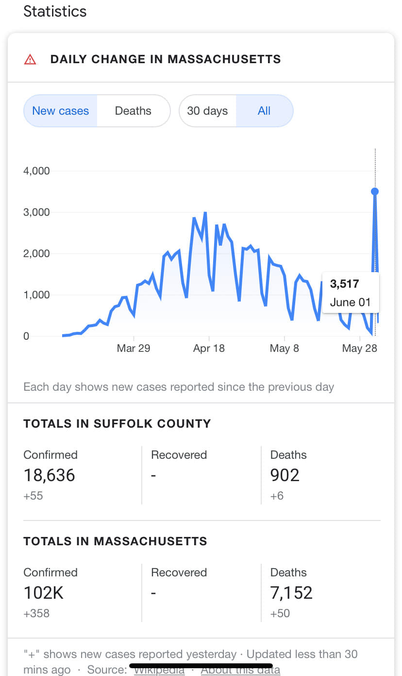 This is a screenshot of the number of Covid-19 cases in Massachussetts as of June 1st. Massachusetts announced that they were going to be including probable cases in their reports, so there was a major spike in the number of cases on the 1st of June.