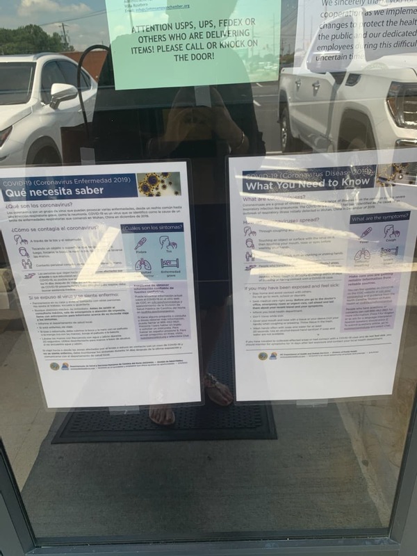 This is a photograph of informational signage outside of the Civic Center in Clinton, North Carolina. The sign is written in both English and Spanish, illustrating how the Clinton was making information accessible to its diverse population.
