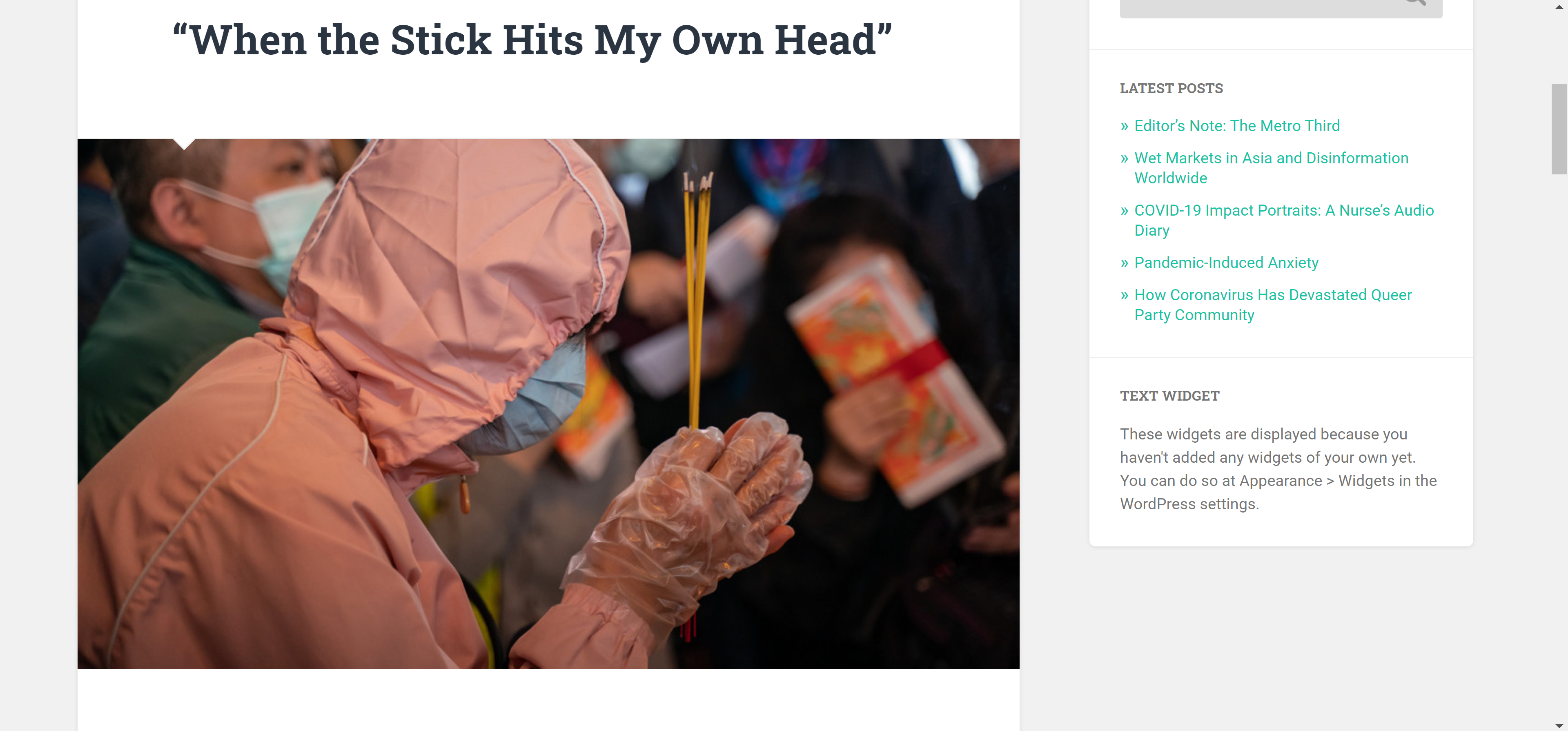 This article describes the pandemic in China and its effect on Chinese citizens and was written by a senior journalism student following a beat developed and thought about in terms of the "local" in a journalism course at Pratt Institute that was upended by the pandemic.
