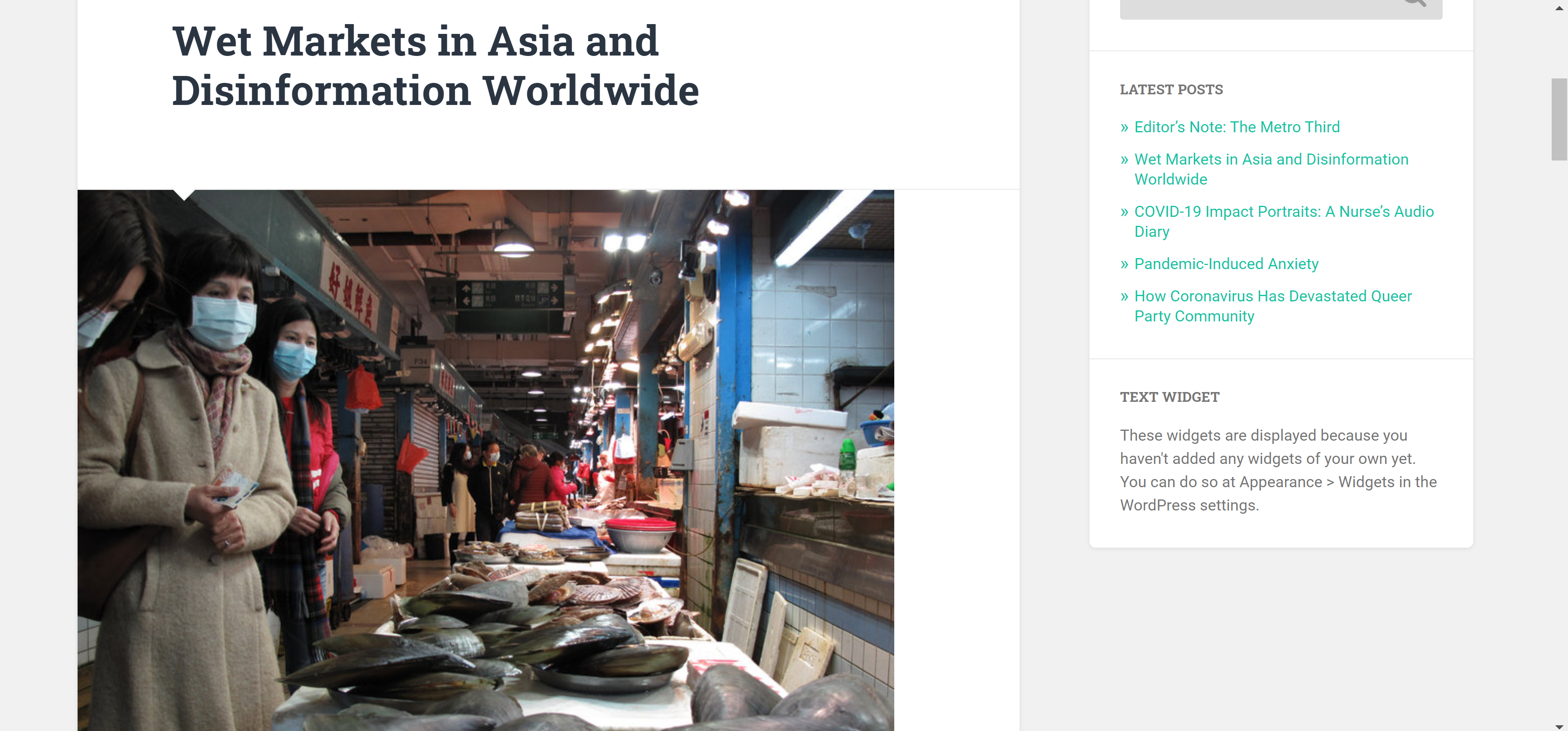This article describes wet markets in Asia and the impact of the pandemic on these markets and was written by a senior journalism student following a beat developed and thought about in terms of the "local" in a journalism course at Pratt Institute that was upended by the pandemic.