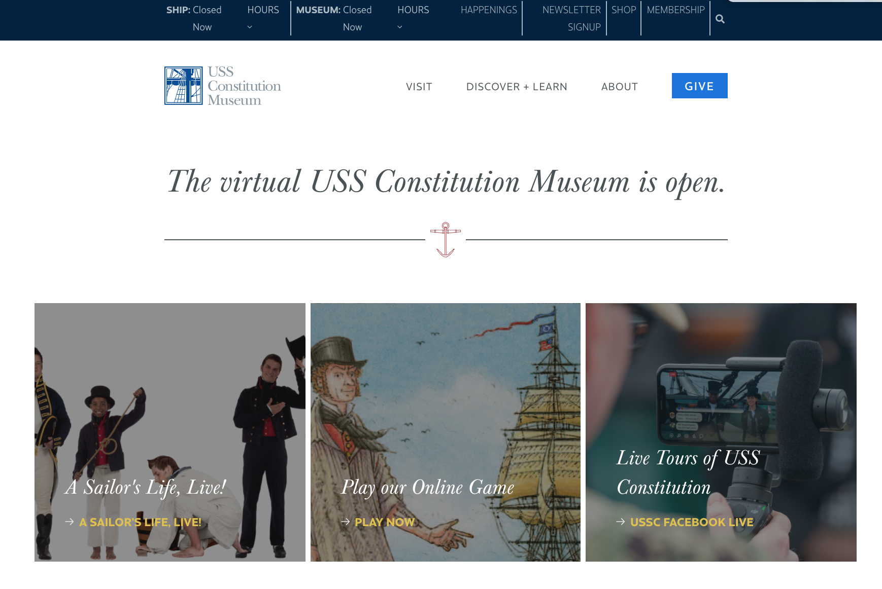 The USS Constitution Museum website has pivoted to encourage online engagement with the museum. The new home page offers online games, live tours, and various "at home" activities for museum visitors to explore during social distancing due to COVID19.