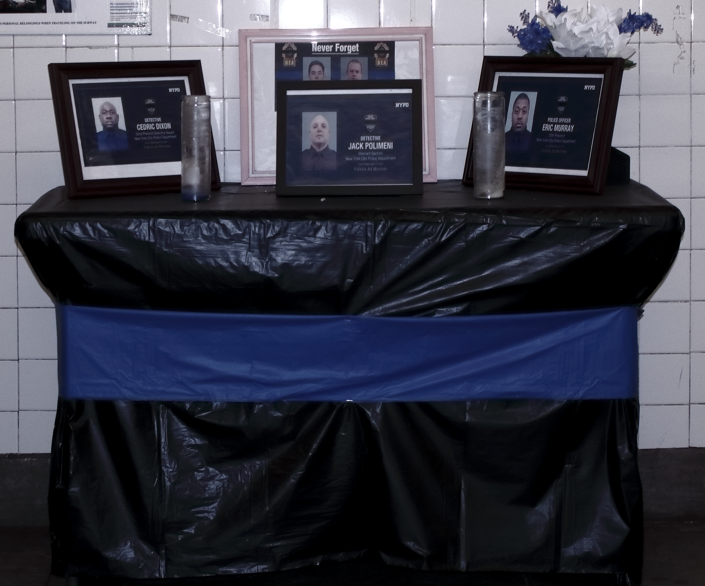 A photograph of a memorial in my local subway station outside of a police station