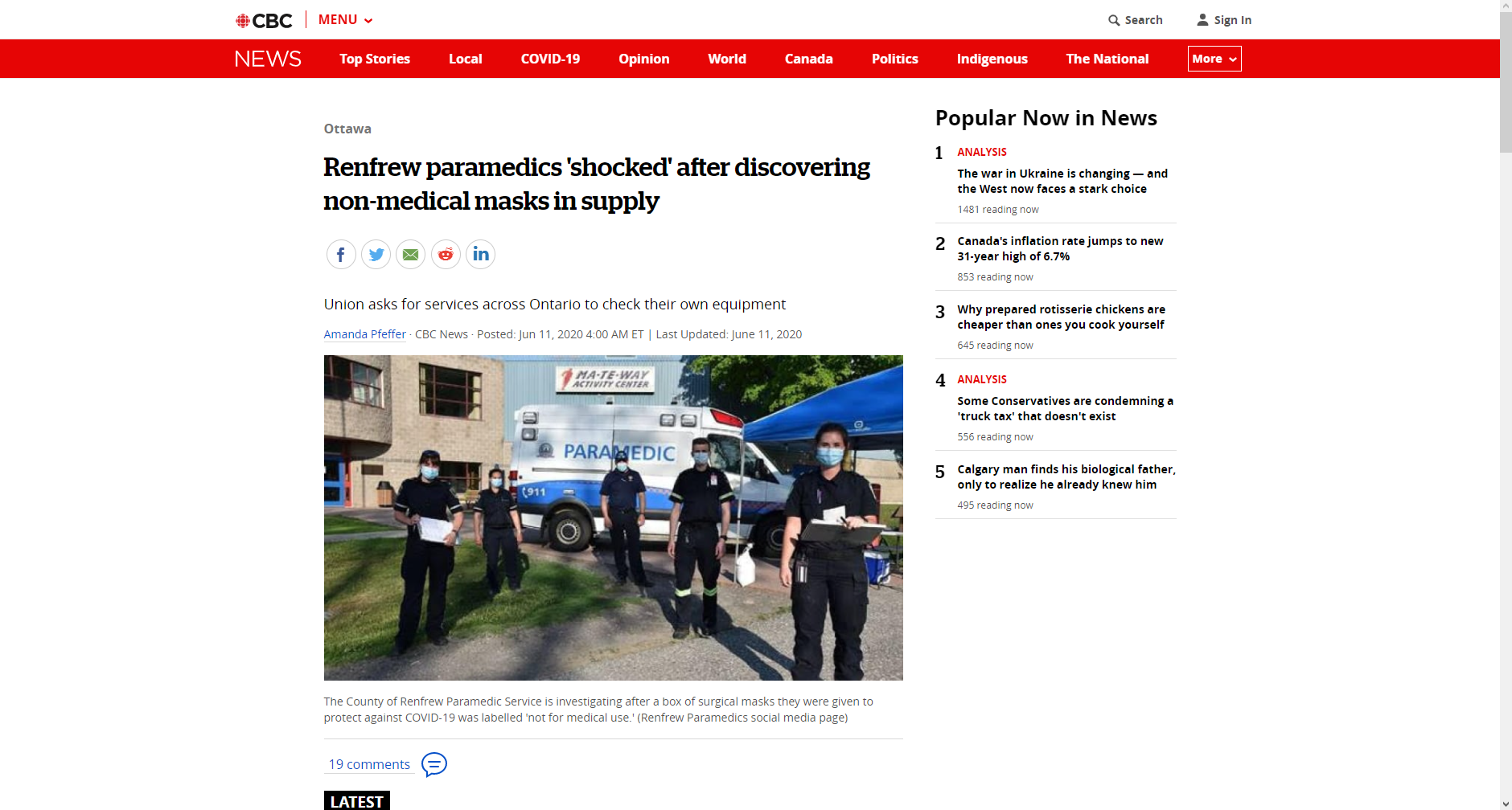 News story about non-medical masks discovered amongst the supply provided to Renfrew County paramedics and the resulting need for extensive Covid-19 testing of paramedics and those who had used the ambulance service during the period when the masks were in circulation. The incident serves as an example of the trust that equipment, even when it is available, will protect workers and the public being broken.