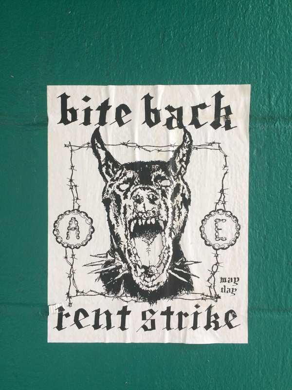 A sign hanging outside a grocery store reads "Bite Back Rent Strike A E May Day." During the pandemic, many people are unable to work or earn income and attempts have been made to organize a rent strike.