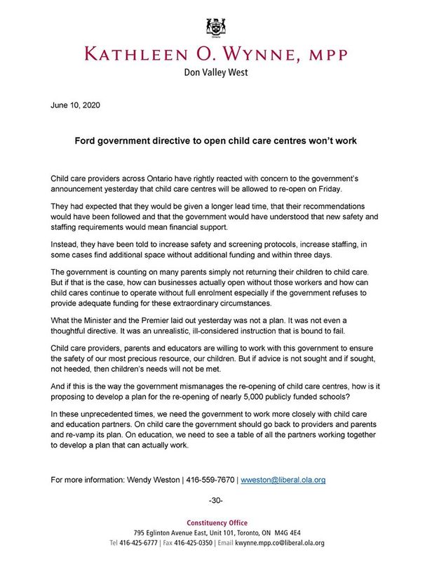 'Ford government directive to open child care centres won't work': Public Statement from Kathleen Wynne