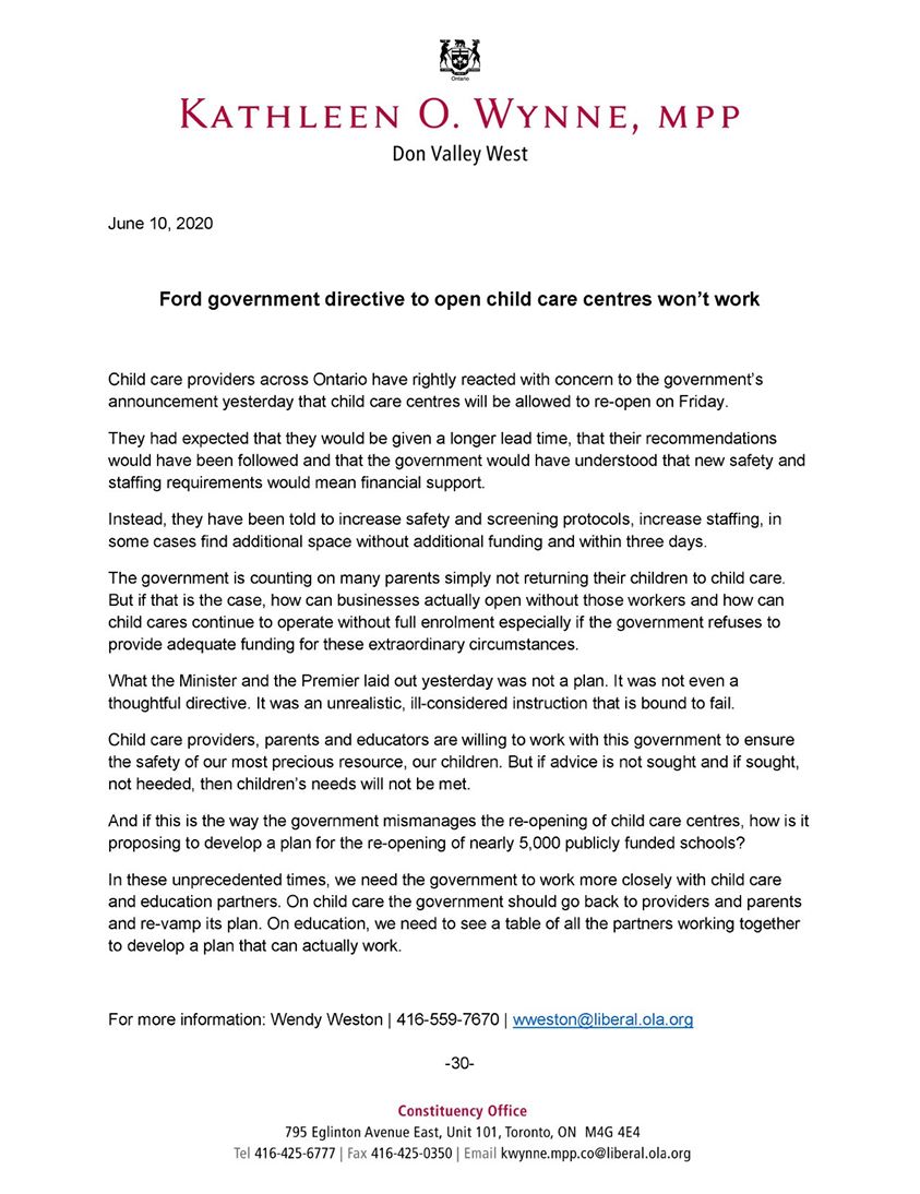 An public statement shared on Facebook by Kathleen Wynne and then by various childcare professionals and sympathetic parties. It was retrieved from the Facebook page of a Early Childhood Educator. Kathleen Wynne, a member of Provincial Parliament, former Premier of Ontario, and a former teacher, wrote this in response to action taken by Premier of the province of Ontario, Doug Ford and the Provincial Minister of Education, and Conservative government in the province, that they will reopen all childcare centres in Ontario effective Friday June 11, 2020 as part of their tiered 'reopening' of the province from Covid-19 restrictions. It is Ms. Wynne's opinion that centres are being provided with insufficient time and resources to do so safely for staff and children.