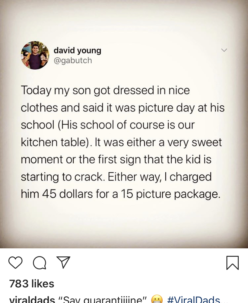 The humor here is that quarantine and home schooling was hard on everyone and so many of us were stressed and pushed to the max—including the kids. So by dressing up in his finest and announcing it was time to take the school photo, either the kid was very sweet and trying to recreate his past life, or he was cracking under the pressure—like his parents were on the brink of doing.
