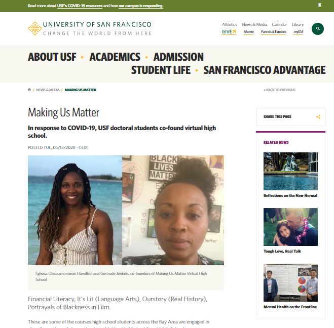 Amidst school closures across the country due to the COVID-19 pandemic, University of San Francisco doctoral students, Eghosa Obaizamomwan Hamilton and Gertrude Jenkins, founded and launched Making Us Matter Virtual High School in March 2020. While educational equity issues compounded as a result of nation-wide school closures, Hamilton and Jenkins built an educational platform in which a collective of Black educators would create challenging and empowering curriculum focused on social justice and Blackness. Making Us Matter is offered, free of charge, to any student interested in curriculum focused on Black-inclusion. While educational institutions have scrambled in their attempts to serve students during the COVID-19 pandemic, Making Us Matter is a shining example of how educational leaders can disrupt education and build learning experiences that challenge the shortcomings of traditional educational models.