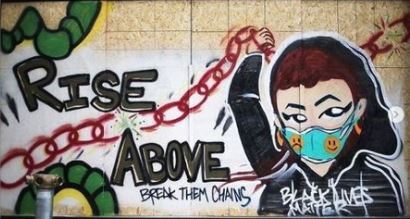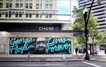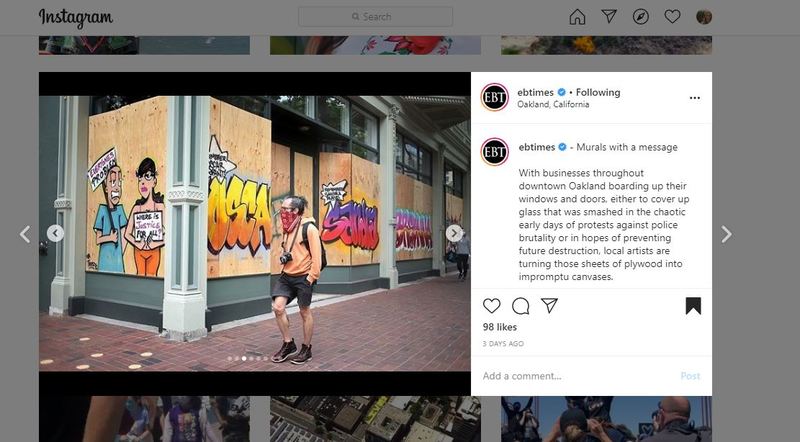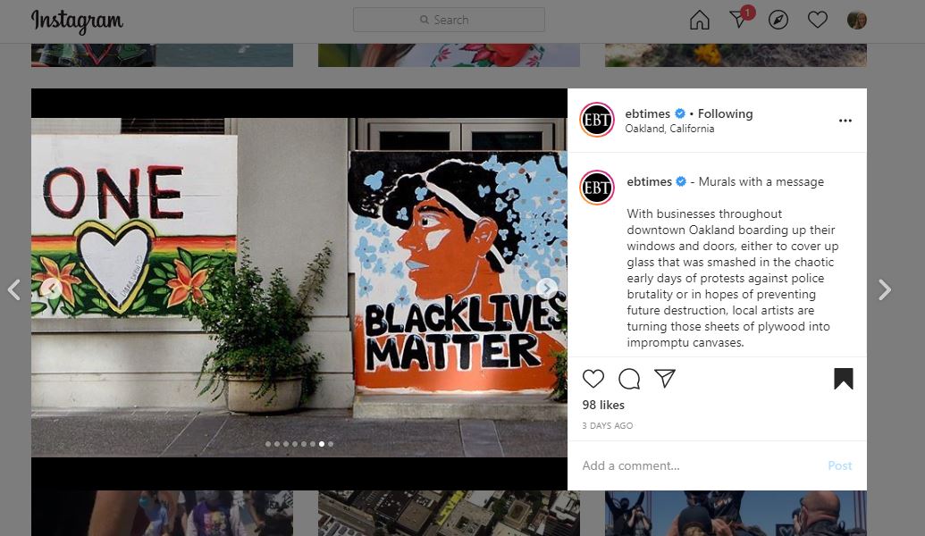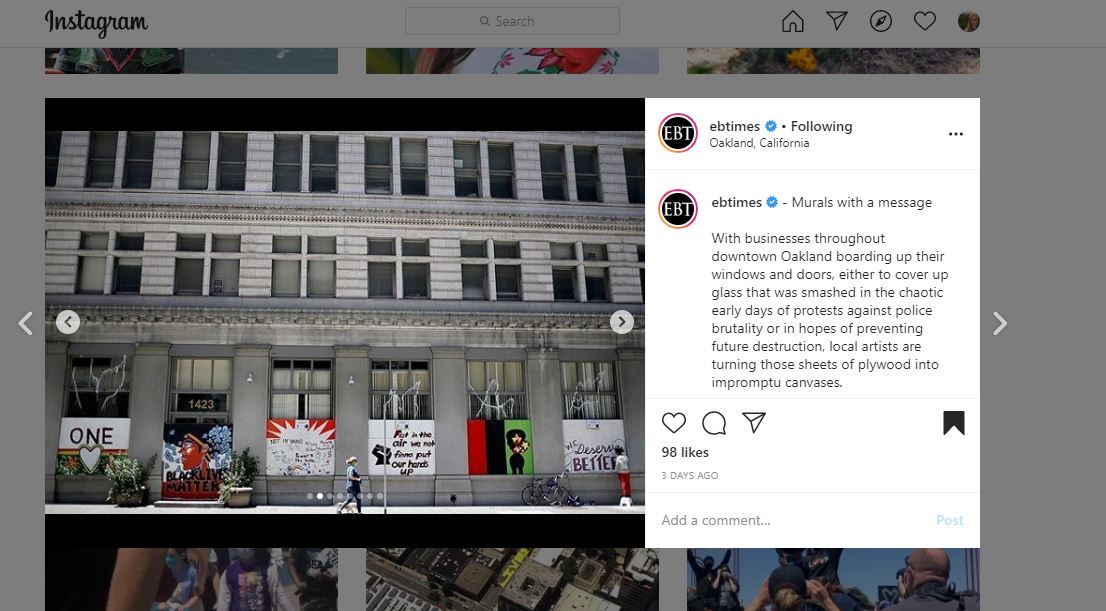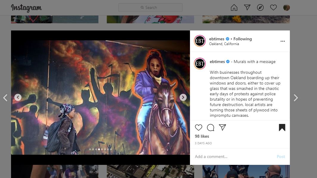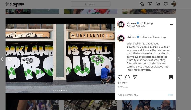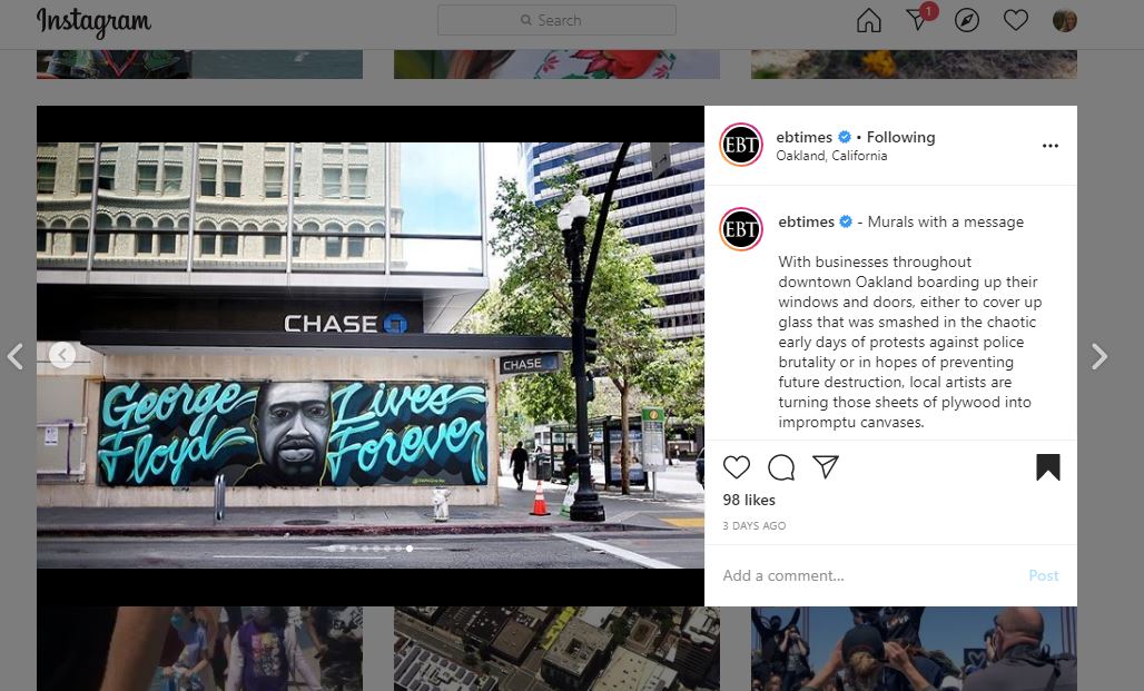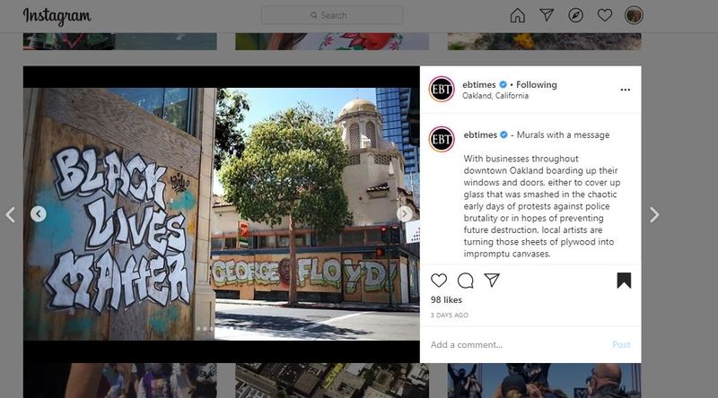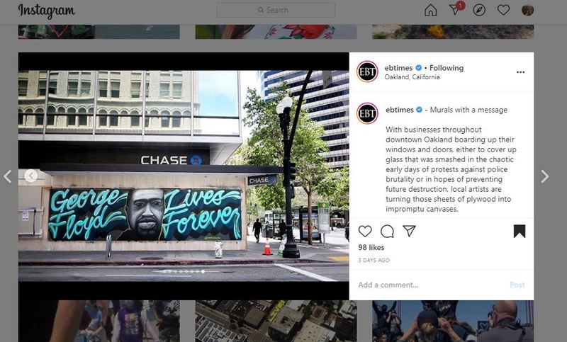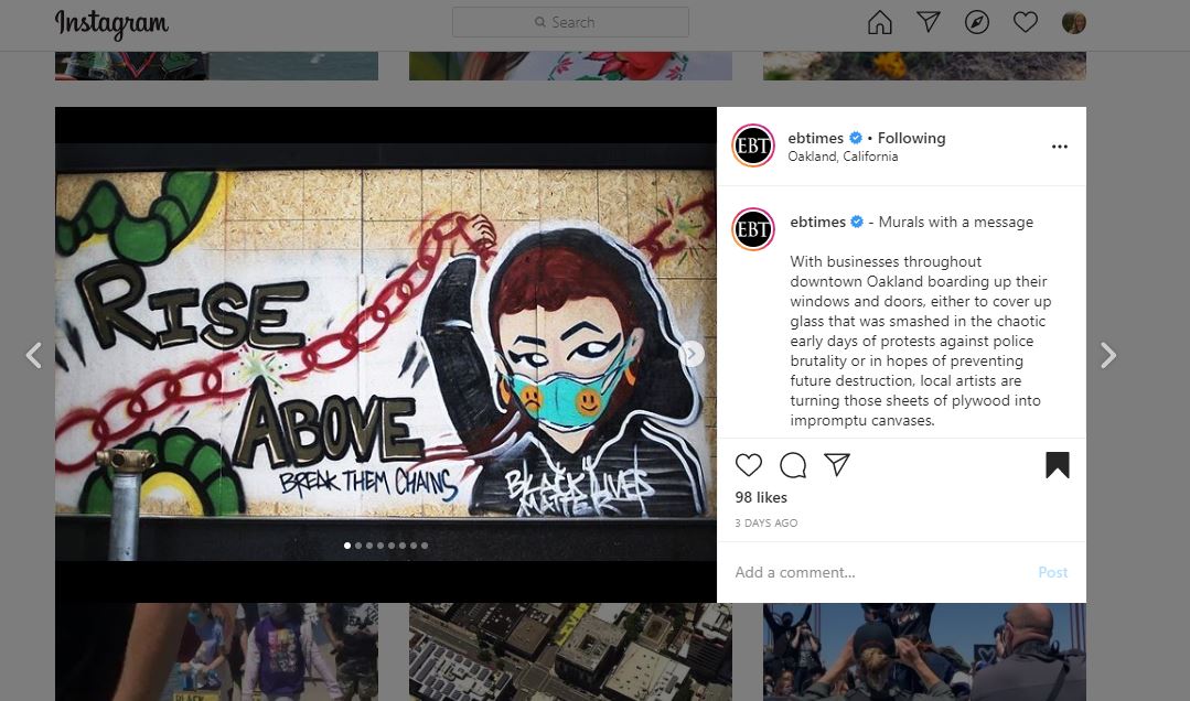 Local Bay Area artists are creating powerful social justice themed murals on the plywood used to board up Oakland businesses that were impacted in the chaos of the protests that began May 29, 2020 and are continuing over two weeks later. The art is capturing specific and unique elements of the current protests. One mural depicts a protestor wearing a mask as a result of the COVID-19 pandemic. Black Lives Matter and George Floyd are the subjects of many of the pieces. One large piece of art includes an image of Brianna Noble, who rode a horse during the May 29, 2020 protests. Another includes the names of victims of police brutality; visible are Oscar Grant, Sandra Bland and Breonna Taylor. Finally, one mural reads "Oakland Is Still Proud."