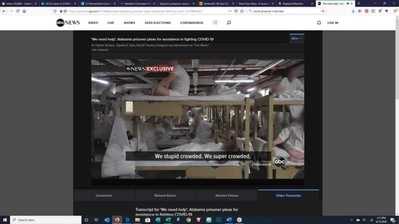 ABC News video showing video from inside an Alabama prison and the inmates inability to social distance. The prisoner on the video asks for HELP. As of the date of this video no Alabama prisoner had tested positive for the virus though at least two employees have tested positive. After the interview with the prisoner the host goes on to discuss the issue with a former female inmate and a former doctor in charge of prison health in another state. The host also interviews a sheriff who argues that releasing inmates is not safe for the community.