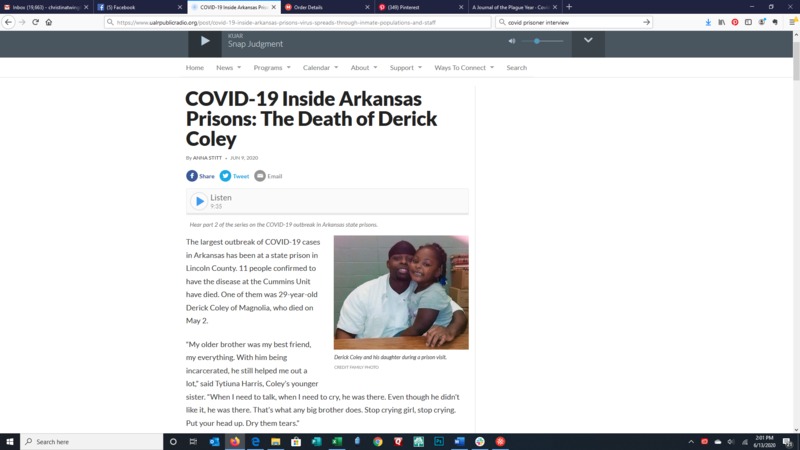 This article is the second in a three-part series by NPR reporter Anna Stitt. Sponsored by the National Geographic Society's COVID-19 Emergency Fund for Journalists. In this article Stitt mostly focuses on the death of inmate Derrick Coley. He was a healthy 29-year-old inmate who had been up for parole since June of 2017 but once he contracted covid in the Cummins Unit, part of the Arkansas State Prisons, he passed away. In exploring his death Stitt finds that inmates who pay $3 each time they request medical attention ( this was waved from March 23-April 30, 2020) were often not receiving any medical attention and at other times would only see a nurse. The process relayed to her was that inmates must request medical attention four times before they can see a doctor and the only doctor is one whose medical license has been revoked. After several inmates died from covid some inmates began to rebel. Prison staff used tear gas to quell the uprising. This was surprising to inmates Stitt spoke with because the coronavirus is a respiratory virus and at the time over 900 people were infected.