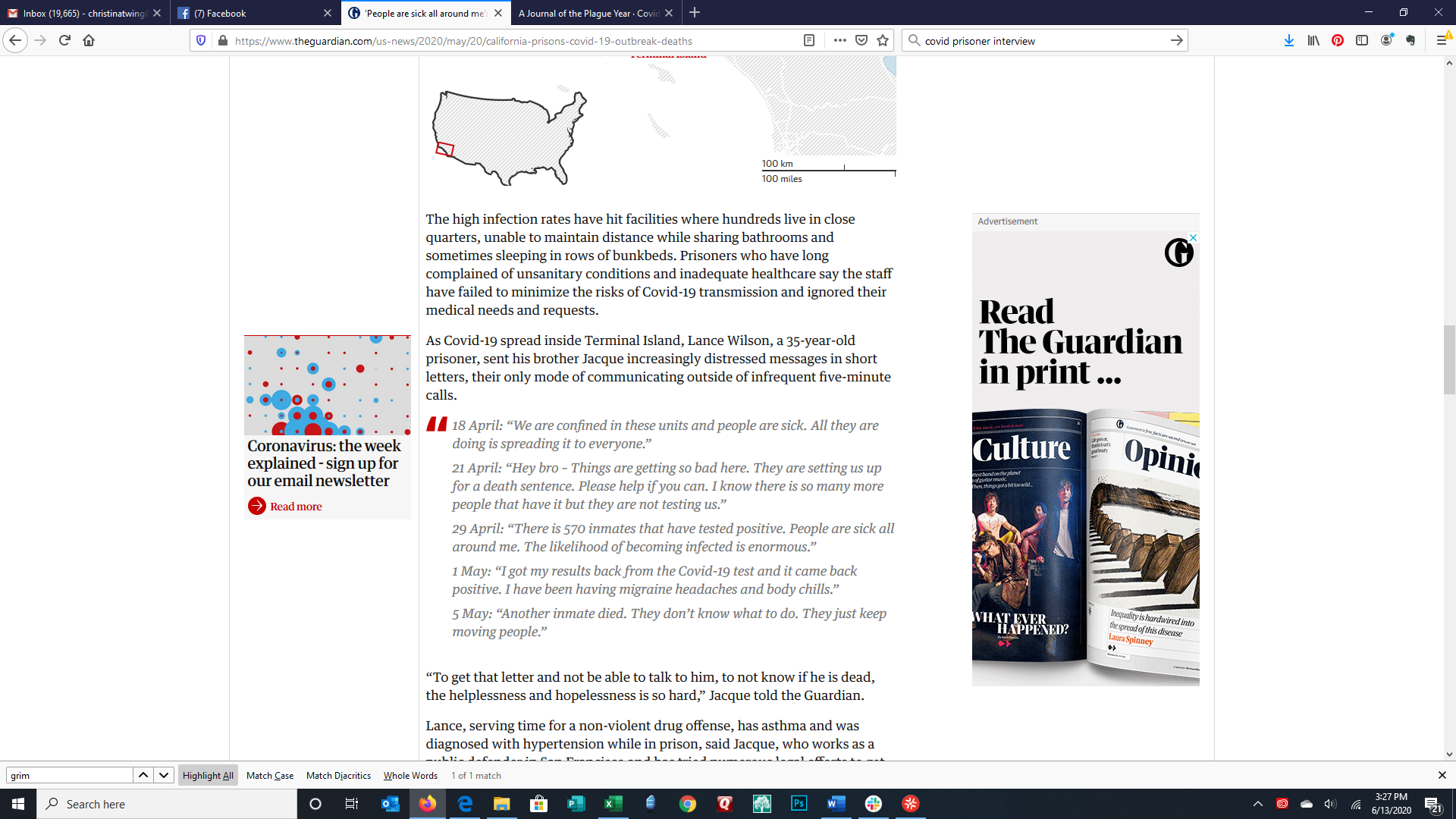 Due to the closer quarters and overcrowding in the nation's prisons they are a breeding ground for easy transmission of the coronavirus. As this article states the "public health catastrophe" inside the country's prisons was "predictable and preventable." California has over 25,000 covid positive inmates as of this article’s writing (05/20/2020), and more in other detention facilities. The outbreak doesn't look like it will slow down anytime soon. This article discusses the conditions inside of California prisons based on inmate communications and talking with family members.