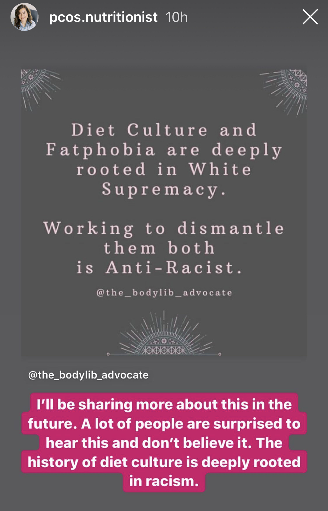 It's not a topic people want to talk about, and most people do not even know the history behind diet culture and fatphobia in the United States. Food is a powerful tool that has been used to convey morality and racial supremacy to Americans for more than a century. As Americans have been in lockdown since March, terms like "quarantine-15" and "the covid-19," have become common phrases to shame weight gain due to anxiety, disrupted eating habits, and food scarcity. The current protests and push for the end of racism has many anti-diet culture dieticians and nutritionists speaking up about not only the ugly history of diet culture and fatphobia but the current situation of fat-shaming people for gaining weight during a global pandemic. This meme shared publicly through an Instagram story is one such attempt by nutrition professionals to call attention to the issue of racism, diet culture, and fatphobia. Contributed by Stephanie Berry, a curatorial intern for Arizona State University, HST580.