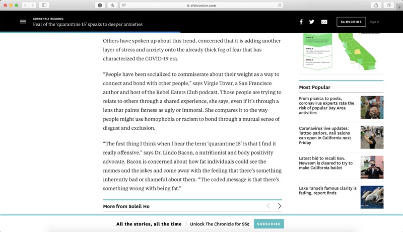 This article discusses the emergence of the phrase “quarantine 15” and the impact of anti-fatness on our society even as it is being ravaged by a global pandemic. Author Virgie Tovar ties the phrase to people's need to connect and the ease of doing so through self-deprecation. Dr. Lindo Bacon attributes the trend to the anxieties of dealing with isolation and other factors directly connected to the coronavirus pandemic and our social stigma against mental health issues. Which reason is more accurate is tough to say and may differ from individual to individual. What is certain is that while people are dealing with changes to their food habits and environmental stressors they are also being pressured to lose weight.