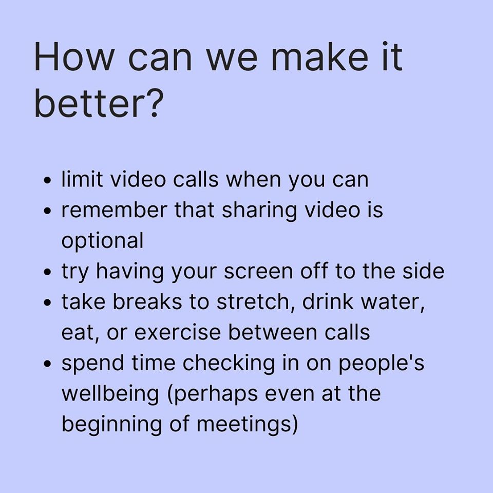 With the pandemic came online learning and being forced into a class room situation where everything was mediated through our screens. I found this learning style to be mentally draining and had felt that I was alone in my experience when all I saw online was people celebrating the wonders of connecting through zoom. Seeing this infographic which acknowledges zoom exhaustion and breaks down why it happens and ways to overcome it was really nice. It shows that my experience is felt by many and while technology has allowed many of us to stay connected it isn't with negatives.