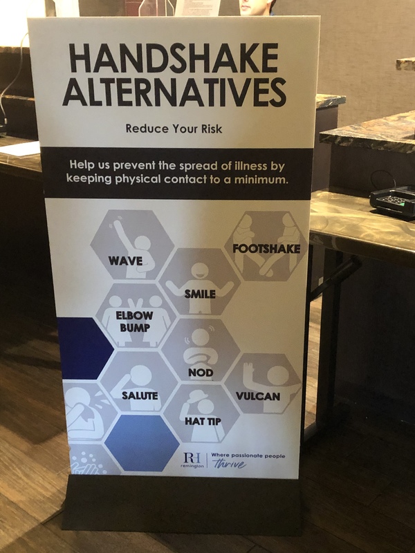 At the hotel, the seating area in the lobby was blocked off, and the free breakfast was a sack breakfast that you requested from the front desk. Even the bar area where there is usually a free happy hour was closed. The front desk staff wore masks, and they even had a sign up suggesting handshake alternatives. Housekeeping staff did not do a daily cleaning as a way to limit contact with guests.