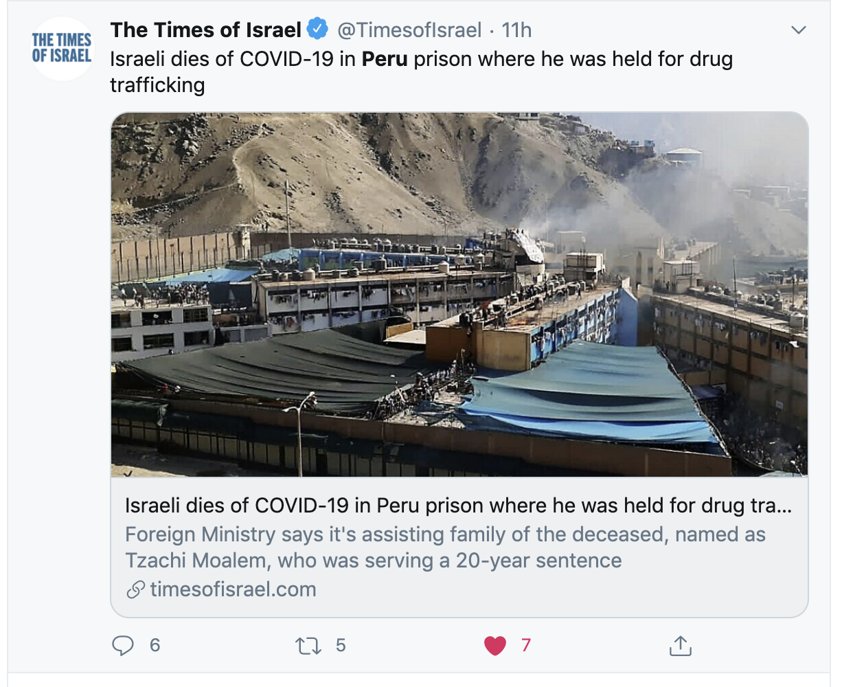 Israeli dies of COVID-19 in Peru prison where he was held for drug trafficking