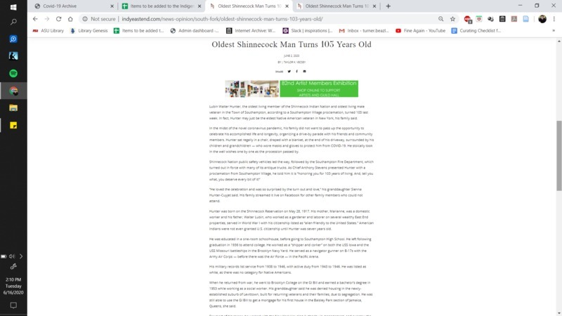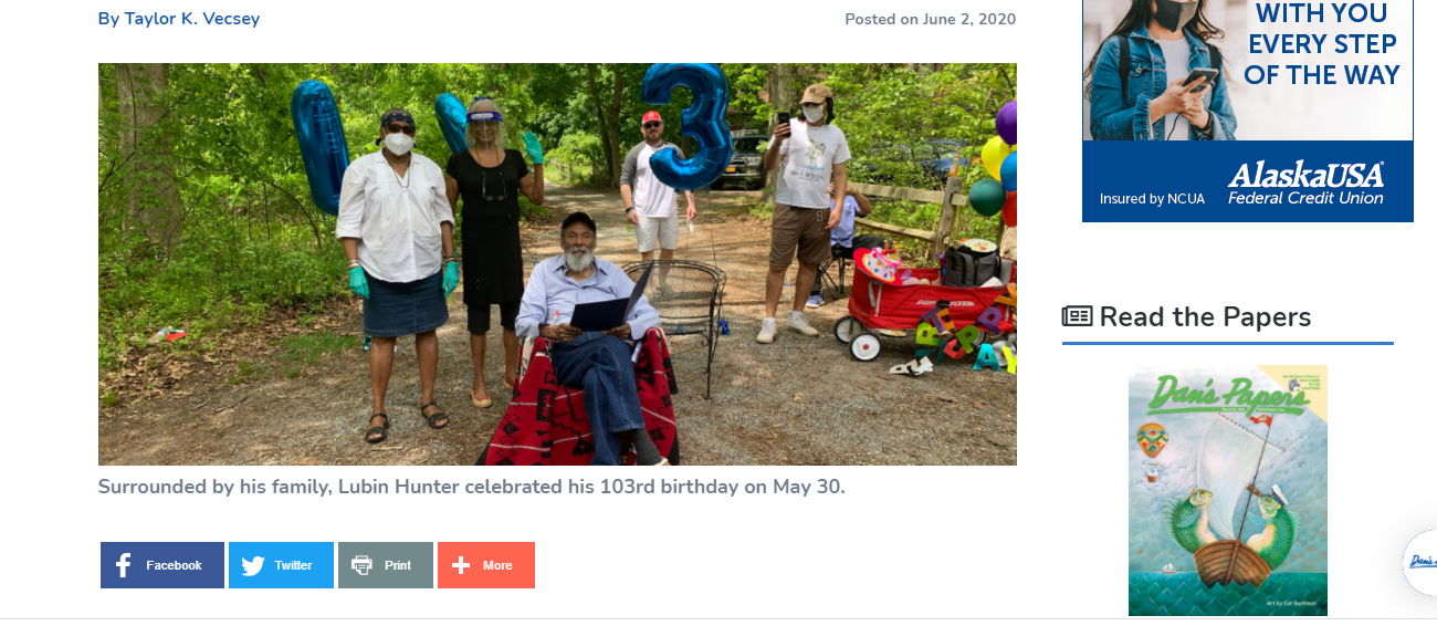 “Lubin Walter Hunter, the oldest living member of the Shinnecock Indian Nation and oldest living male veteran in the Town of Southampton, according to a Southampton Village proclamation, turned 103 last week. In fact, Hunter may just be the eldest Native American veteran in New York, his family said. In the midst of the novel coronavirus pandemic, his family did not want to pass up the opportunity to celebrate his accomplished life and longevity, organizing a drive-by parade with his friends and community members. Hunter sat regally in a chair, draped with a blanket, at the end of his driveway, surrounded by his children and grandchildren — who wore masks and gloves to protect him from COVID-19. He stoically took in the well wishes one by one as the procession passed by.”