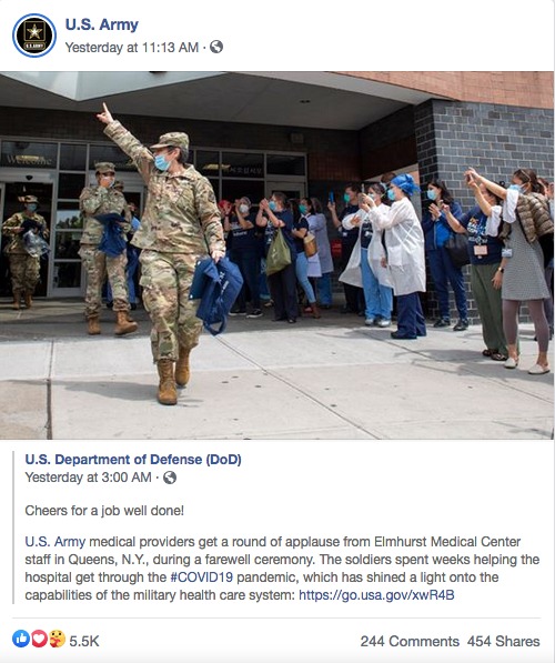 US Army medics and healthcare personnel depart a New York hospital after having spent weeks assisting hospital staff in the relentless fight to halt and treat COVID-19 in virus-besieged New York City. Although the virus appeared to have subsided in the city at the time of this farewell ceremony, the omnipresent threat of infection still loomed large.