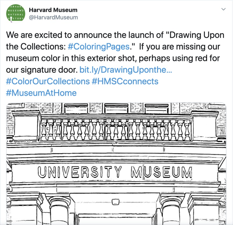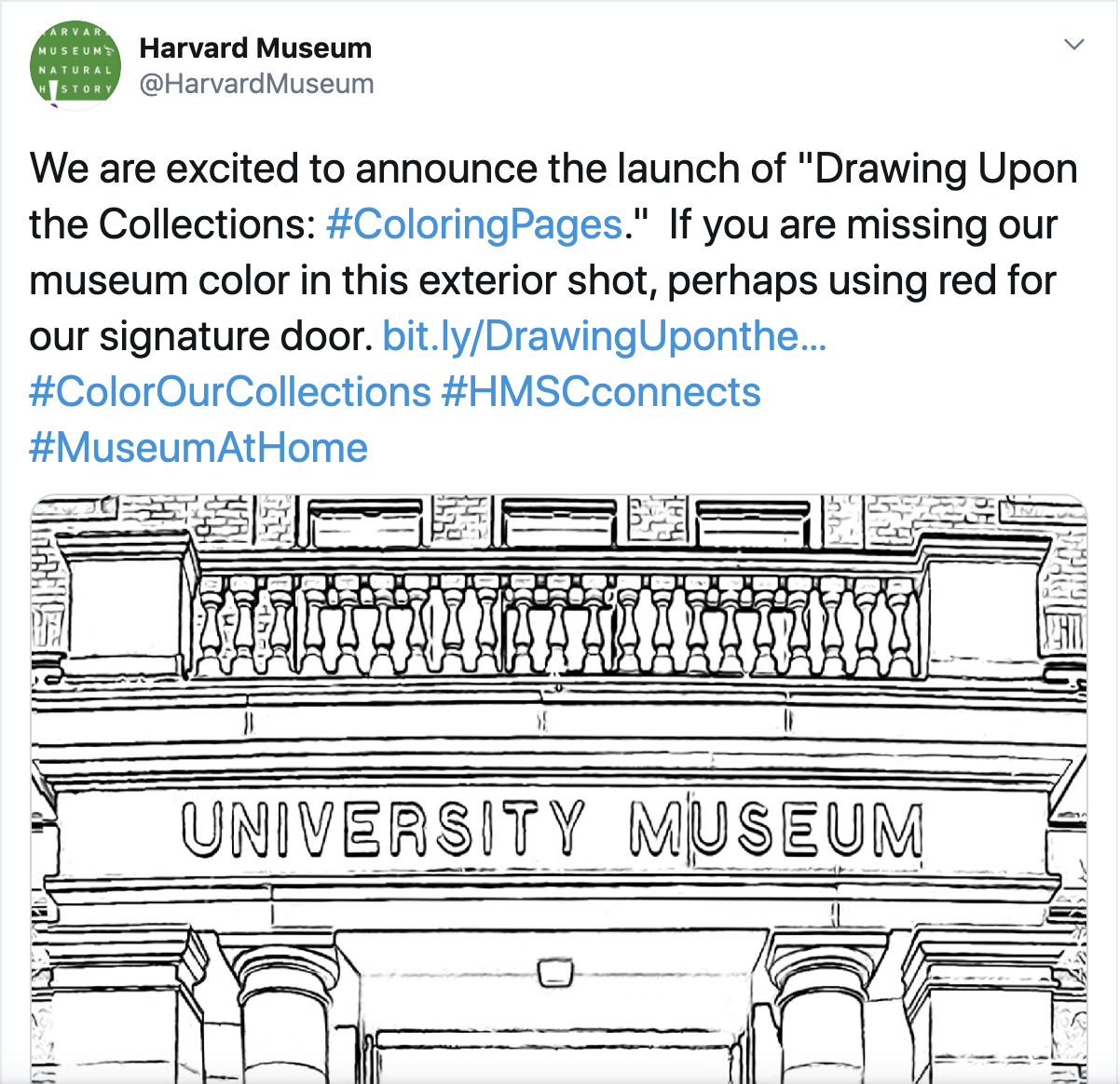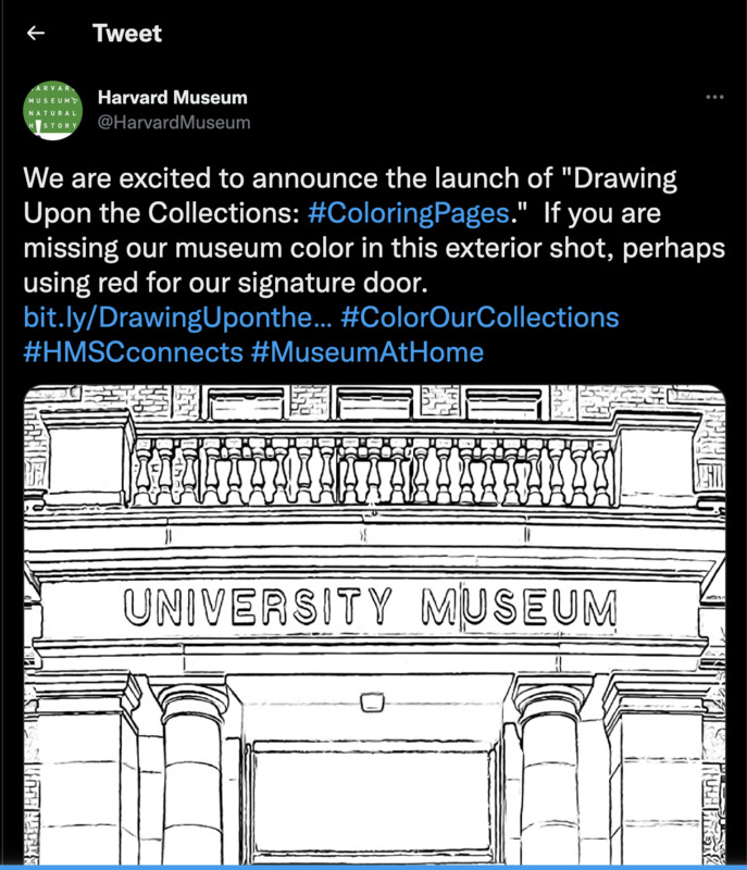 Coloring page for the exterior of the Harvard Museum of Natural History published on their Twitter page as part of the social media campaign #MuseumAtHome. This is also tied to their #ColorOurCollections social media campaign. Both campaigns are part of Boston museums' efforts to engage in socially distanced outreach as a result of the CoVid-19 pandemic.