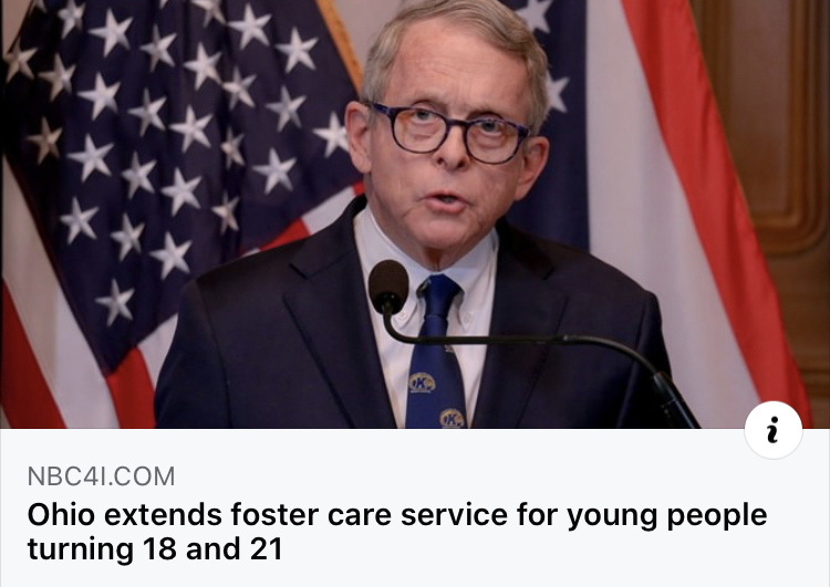 Amid COVID19 shelter in place orders, Governor Mike DeWine announces that the 200+ Ohioians that would "age out" of foster care (by turning 18) May-July 2020 would be able to stay in their foster homes. The state would cover the costs to keep these citizens in place.