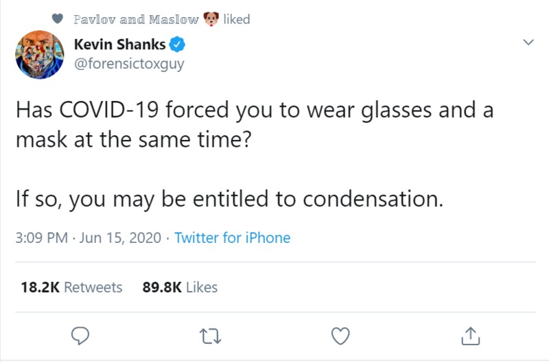 A tweet joking about the common complaint that the direction of condensation from breath is causing people's glasses to fog up when they wear masks.