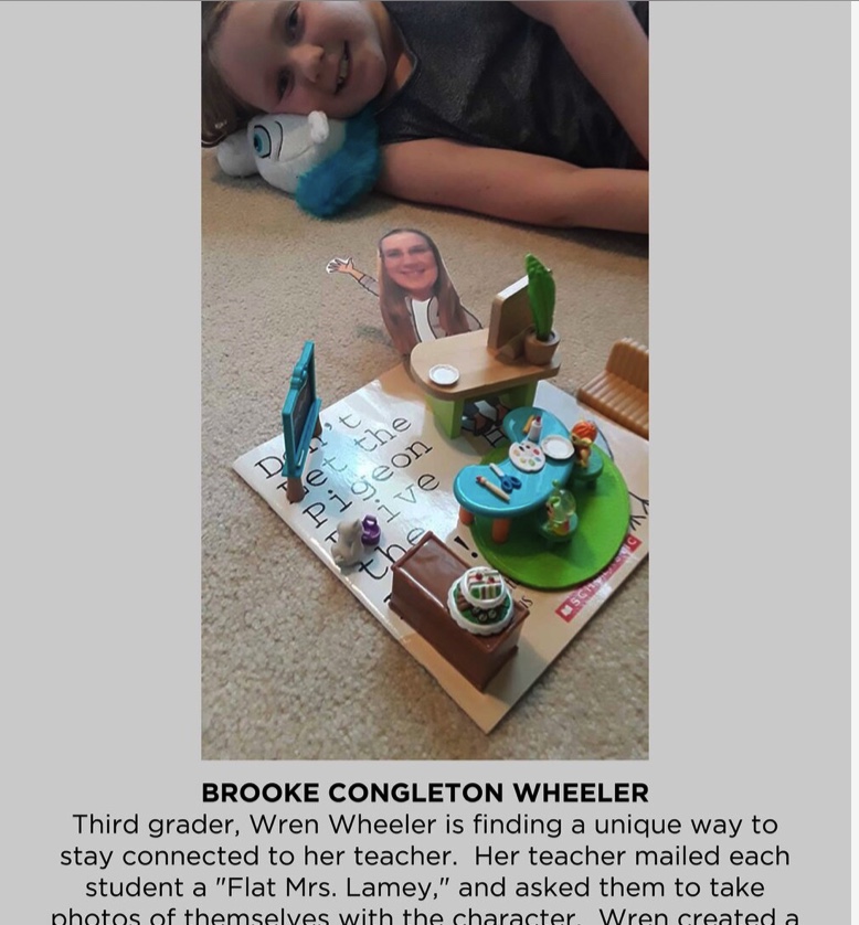 Third grader, Wren Wheeler is finding a unique way to stay connected to her teacher. Her teacher mailed each student a "Flat Mrs. Lamey," and asked them to take photos of themselves with the character. Wren created a whole new classroom for Mrs. Lamey and emailed a photo to her teacher.