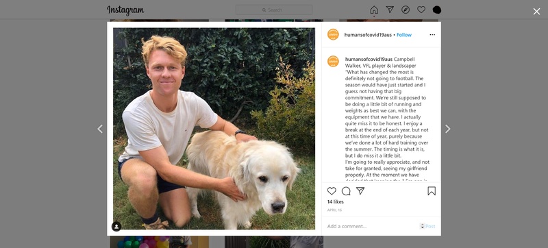 Instagram post on Campbell Walker, VFL player & landscaper, and his experience during the pandemic, which was created by a psychology student living in Melbourne who was interested to hear about how COVID-19 was impacting on different peoples’ lives.
