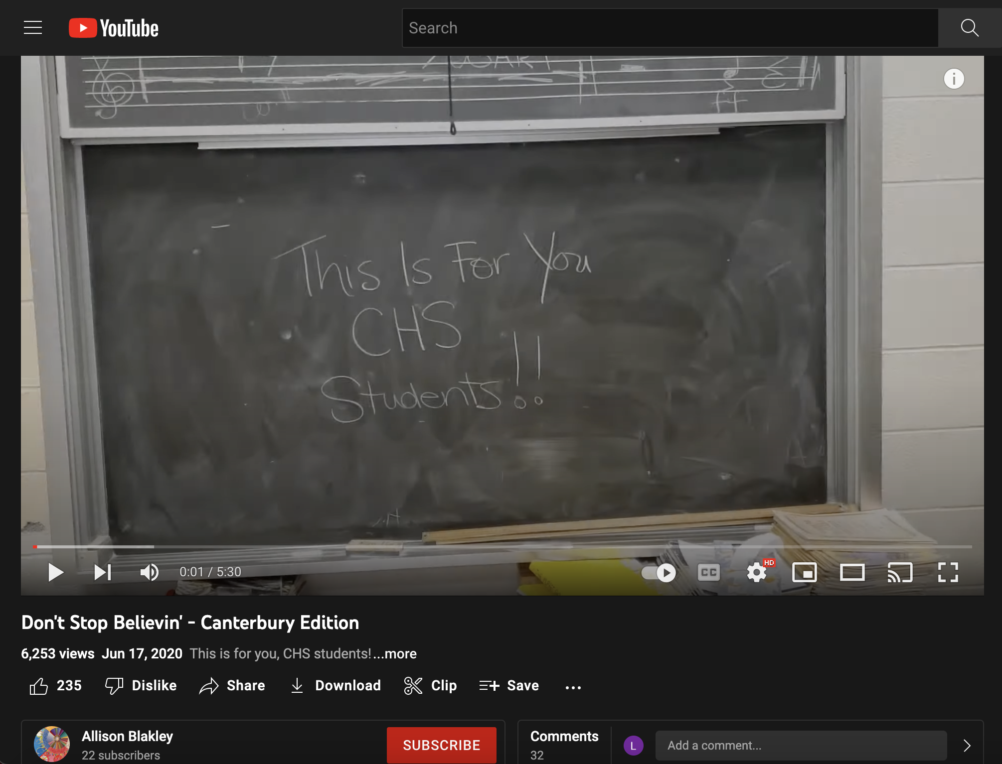 Every year, during the Christmas and end-of the-year "blockbuster" (talent show) assemblies, the entirety of the staff at Canterbury High School put on a song and dance. With schools closed this year they took it online and created video of them in their homes dedicated to the students and graduating class in particular. In choosing the song Don't Stop Believin' they shared a sentiment of hope and understand during a stressful time for students. They also made some inside references in the way they changed the words from the original song: the O-train is notoriously inconsistent and often does not run, hence going nowhere (on top of going nowhere because of restrictions due to the pandemic.)