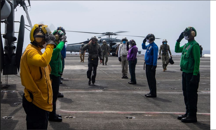 Masked up and spaced apart, the crew of the aircraft carrier USS Harry S. Truman (CVN-75) welcomes Secretary of the Navy Kenneth Braithwaite aboard after they dropped anchor at the Norfolk Navy Yard following a 5-month tour of duty to the Middle East theater of operations and a 2-month "sustainment cruise) off the Virginia coast. The Truman remained at sea after the conclusion of their Middle Eastern cruise due to COVID-19 concerns and the need for deploying carrier groups to quarantine before getting underway and replacing the Truman in the Navy's operational rotation.