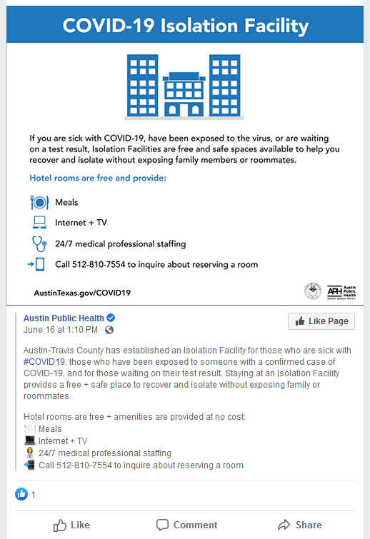 The Austin metro area has seen a large increase in Covid cases over the last two weeks but I was still surprised to see this image appear in my Facebook feed. There is now a place for people to isolate themselves, in a local hotel, while they recover from covid or wait to receive their test results.