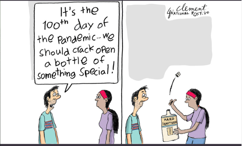 Comic joking about how 100 days would usually be a positive milestone, but in the pandemic the only "something special" we are cracking open is a bottle of hand sanitizer