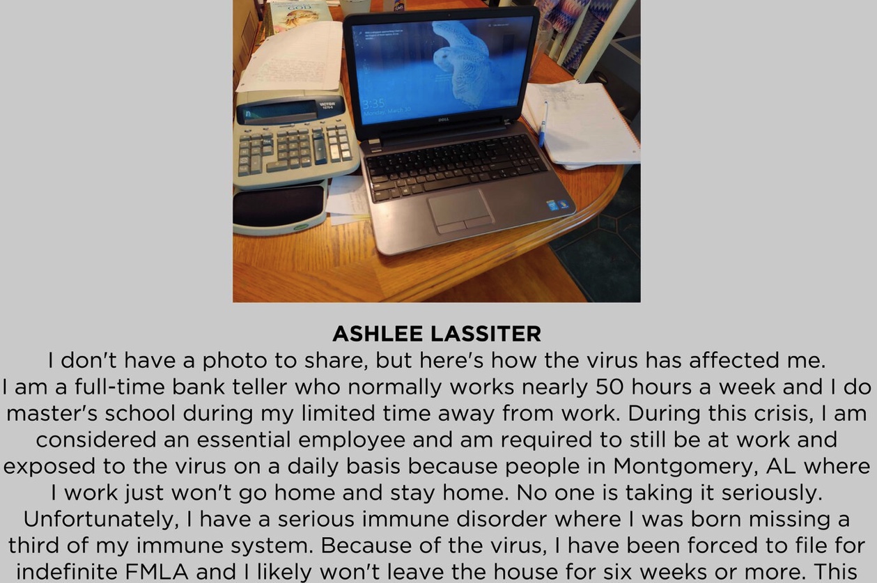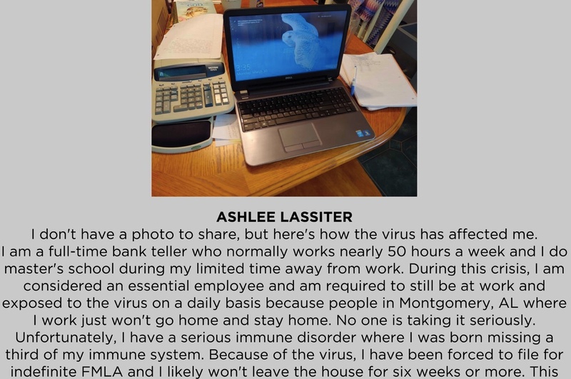 I don't have a photo to share, but here's how the virus has affected me. I am a full-time bank teller who normally works nearly 50 hours a week and I do master's schooling during my limited time away from work. During this crisis, I am considered an essential employee and am required to still be at work and exposed to the virus on a daily basis because people in Montgomery, AL where I work just won't go home and stay home. No one is taking it seriously. Unfortunately, I have a serious immune disorder where I was born missing a third of my immune system.