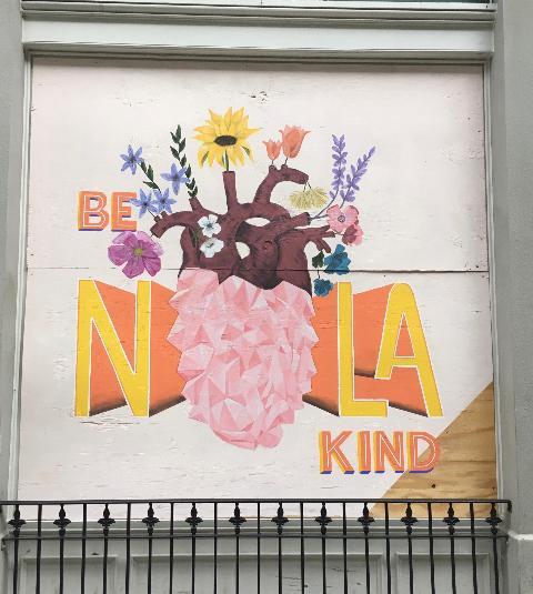 200-block of Dauphine, “Be NOLA Kind” (or "Be Kind NOLA"?) (2020) by Kyleigh Doodles and Bruna Petalla, part of Plywood Project Nola