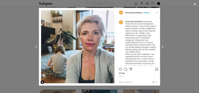 Instagram post on Clementine Ford, writer & host of the Big Sister Hotline podcast, and her experience during the pandemic, which was created by a psychology student living in Melbourne who was interested to hear about how COVID-19 was impacting on different peoples’ lives.