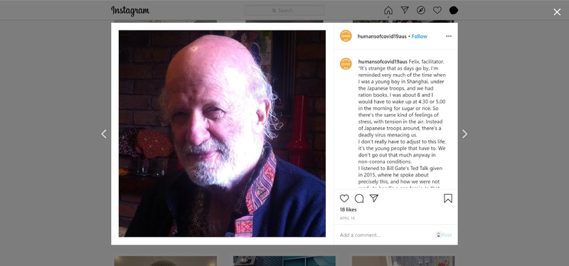 Instagram post on Felix, a facilitator, and his experience during the pandemic, which was created by a psychology student living in Melbourne who was interested to hear about how COVID-19 was impacting on different peoples’ lives.