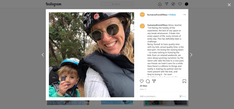 Instagram post on Alissa, a teacher, and her experience during the pandemic, which was created by a psychology student living in Melbourne who was interested to hear about how COVID-19 was impacting on different peoples’ lives.
