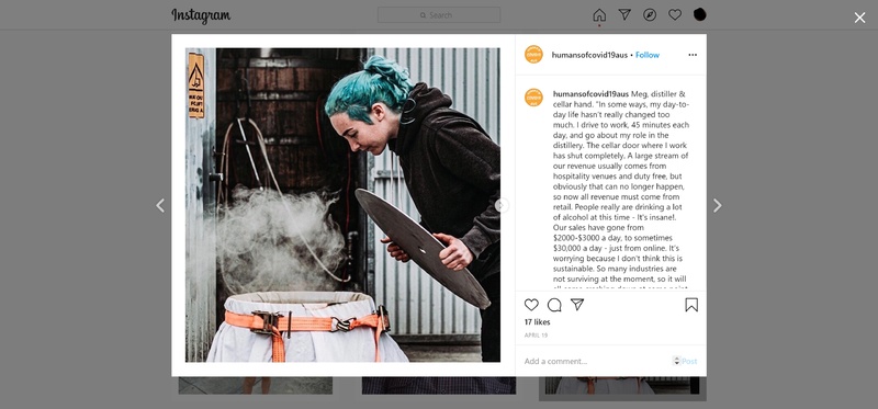 Instagram post on Meg, distiller & cellar hand, and her experience during the pandemic, which was created by a psychology student living in Melbourne who was interested to hear about how COVID-19 was impacting on different peoples’ lives.