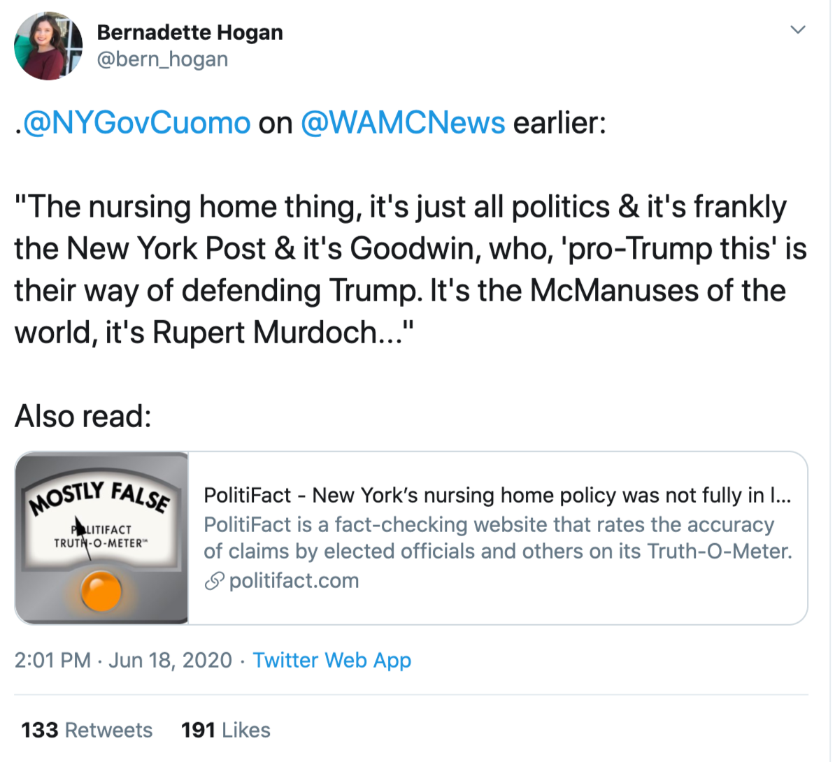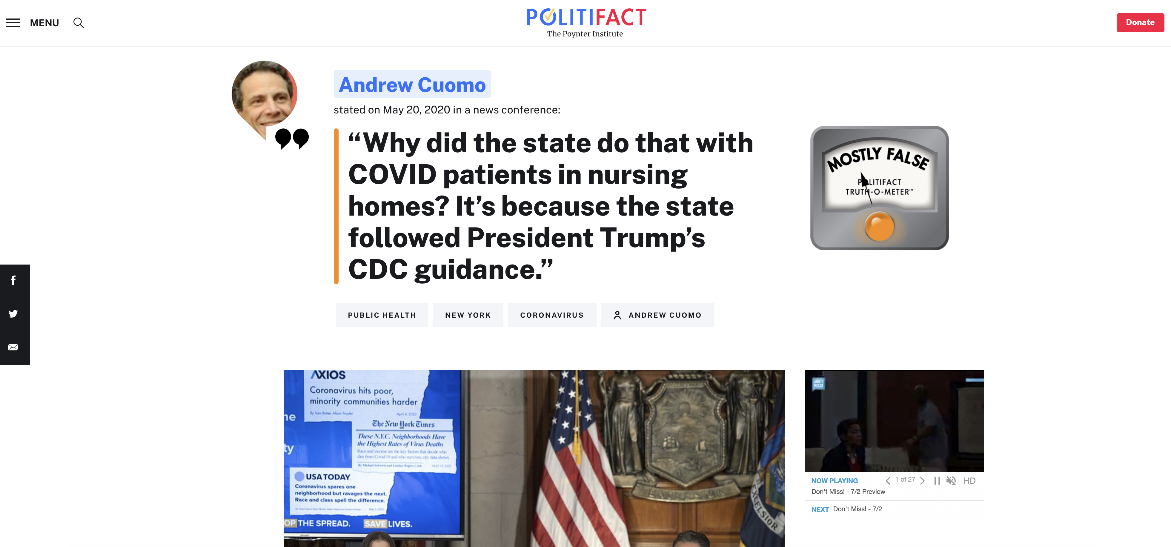 In this tweet, Governor Cuomo is called out on his claim that much of the death and misery in the New York nursing home community was caused because the state tried to follow the CDC guidelines. This was proved to be false, and contradicted a past announcement by the State of New York that nursing homes needed to admit patients only if they were able to care for them. With the scale to which the health system in New York was stretched, many nursing homes felt that they had no choice but to accept patients.