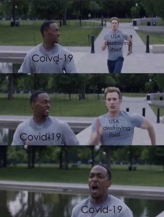 In this scene from the Marvel Universe, Captain America (right) is lapping Falcon (left) and calling out each time he passes him. In the present climate, it seemed as though the US was competing with Covid-19. But the US managed to surpass Covid's destructive potential thus far; we are currently grappling with a cultural war, a racial reckoning, as well as an economic collapse. Hopefully no more laps by the US for a bit.