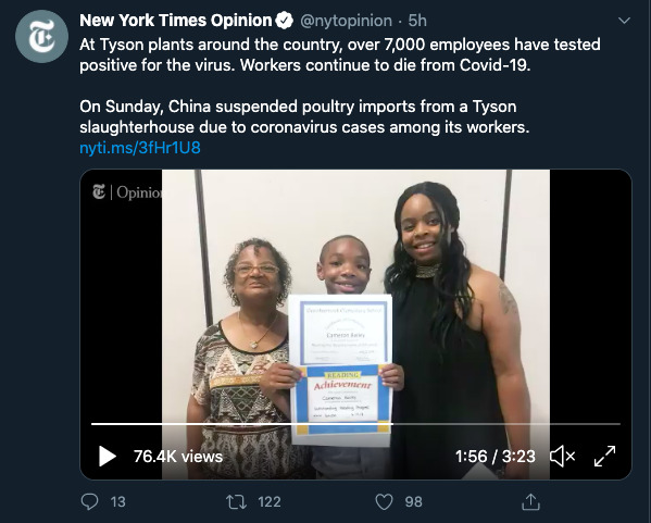 This tweet from the New York Times to one of its articles tells how poultry imports had been suspended by China. It explores how the US has handled the virus in comparison to China has begun to have significant effects on the meat industry. Thousands of meat plant workers have gotten sick, and many have died, and considering the importance of the meat industry this could lead to significant issues in the meat supply chain or overall US meat production. This tweet not only highlights this issue, but also puts the negative spotlight on a household name brand that nearly everyone is familiar with.