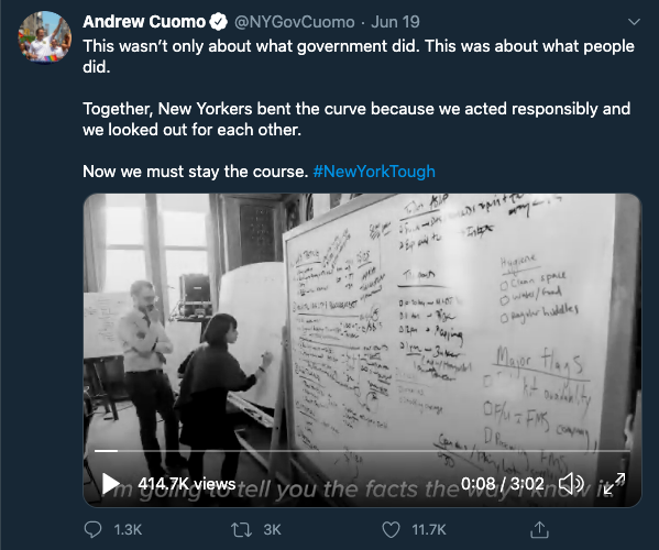 This tweet stood out to me because of the contrast that it had with my state current Covid status. While New York was hit hard early, strict health guidelines have been not only enforced but followed well by the citizens of the state, which has notably flattened their curve. Meanwhile, Arizona was not hit as hard early but has now become a global hotspot for the virus due to lax enforcement of health guidelines, the state opening back up early, and therefore less public following of health and safety guidelines. The two states serve as near opposites of each other in regards to the curve of the virus.