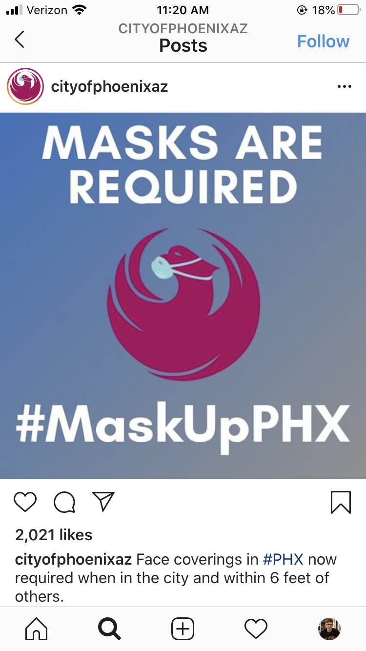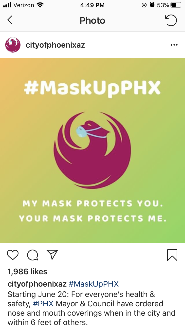 As case numbers in Arizona continue to rise, governor Doug Ducey has finally allowed cities to mandate the usage of masks in public spaces. This is the official City of Phoenix Instagram account publicly supporting face masks.