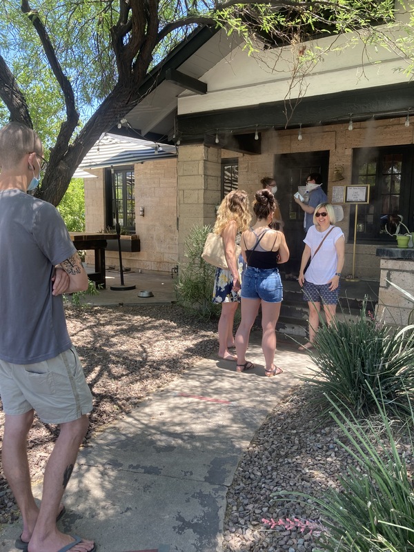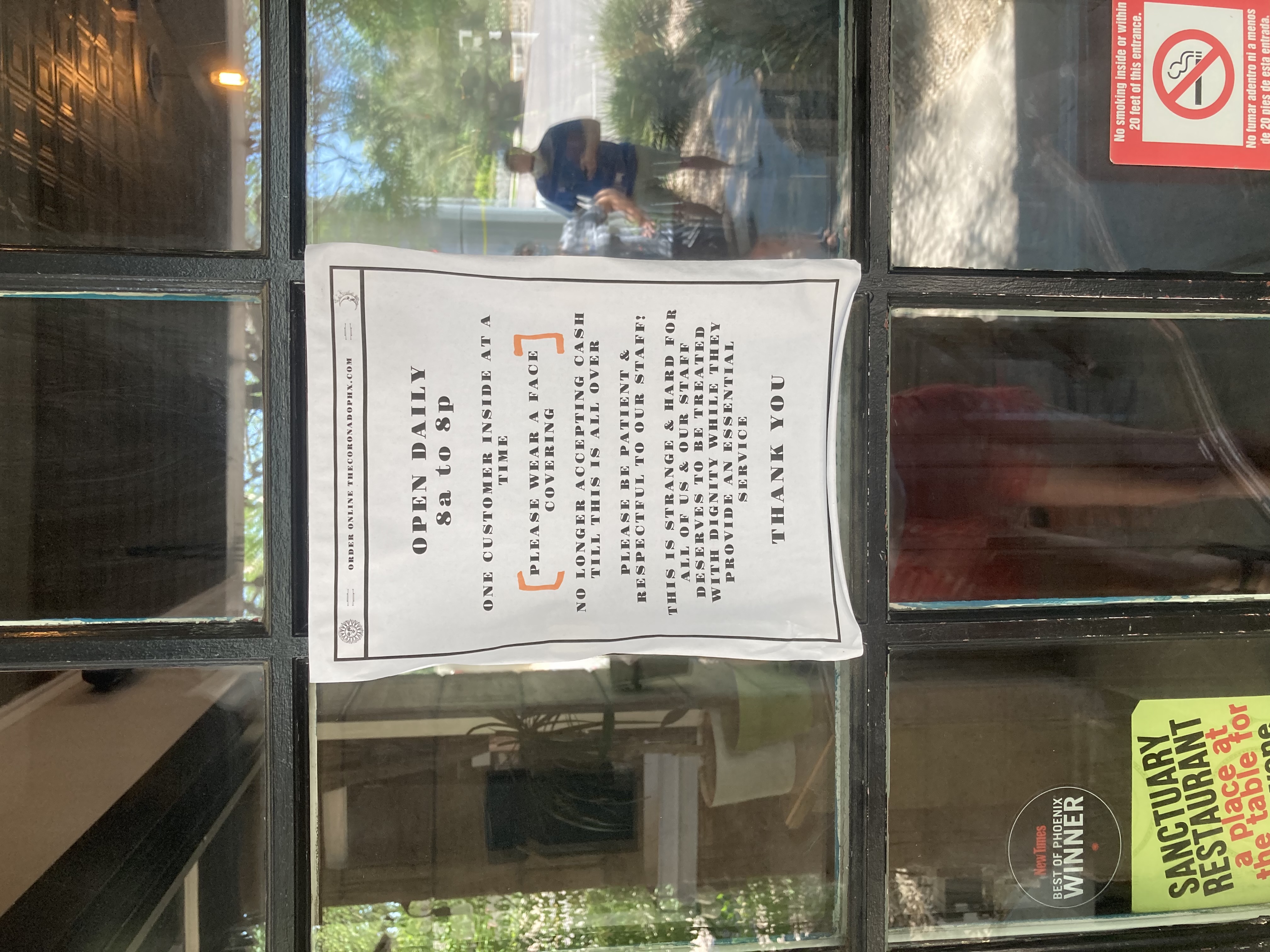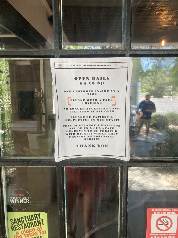 While a lot of restaurants and bars have been terrible, there have been other restaurants which have adapted in really awesome ways. The photos attached here capture my experiences picking up brunch at one of my favorite restaurants in Phoenix, The Coronado, a self described "{Woman + POC + LGBTQ Owned}" vegetarian spot in Phoenix. Early on in the pandemic, the restaurant made adjustments to ensure pick-up would be safe. As you can see in these photographs, the line is clearly marked with red tape so patrons always stay six feet apart, there is never more than one guest in the restaurant at a time, and masks are required. Although not pictured here, inside the restaurant, a plexiglass barrier has been set up to ensure there is a shield between the employees and the patrons, and payment is contact-less so no cash or checks are allowed to reduce contact spread. The Coronado has also been fairly active in Phoenix, using their platforms to highlight the needs and successes of local organizations. It's also possible that they have THE BEST french fries in all of Arizona.