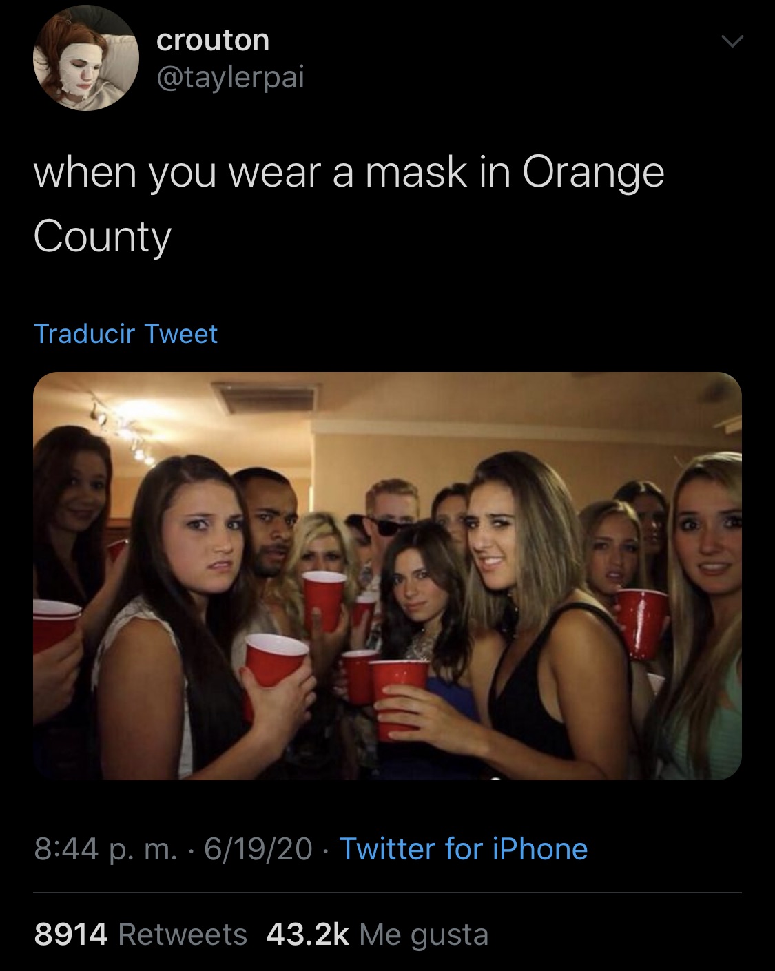 This item was added TAGS v6.1.9.1. I originally searched under the hashtag #orangecounty. Within that search, I have chosen to add the following tweet because it shows the response of many individuals in Orange County when forced to wear a mask. Doing so makes one a bit of a pariah.