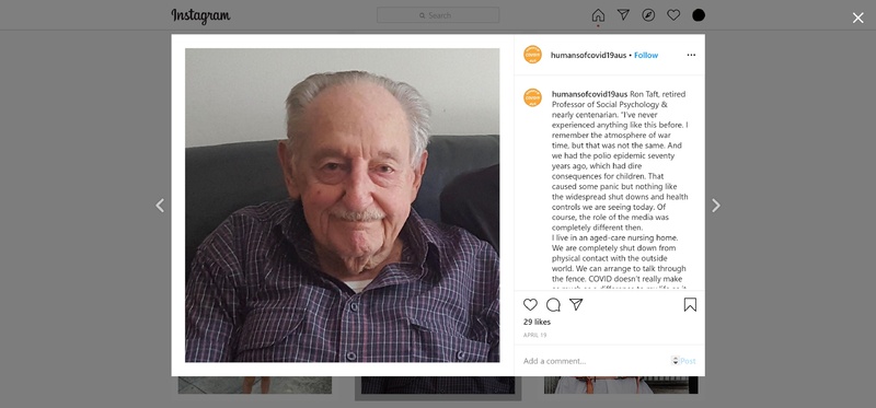 Instagram post on Ron Taft, retired Professor of Social Psychology & nearly centenarian, and his experience during the pandemic, which was created by a psychology student living in Melbourne who was interested to hear about how COVID-19 was impacting on different peoples’ lives.