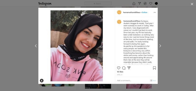 Instagram post on Sumeyya, student, blogger & model, and her experience during the pandemic, which was created by a psychology student living in Melbourne who was interested to hear about how COVID-19 was impacting on different peoples’ lives.