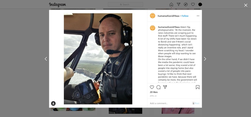 Instagram post on Adam Yip, photojournalist, and his experience during the pandemic, which was created by a psychology student living in Melbourne who was interested to hear about how COVID-19 was impacting on different peoples’ lives.